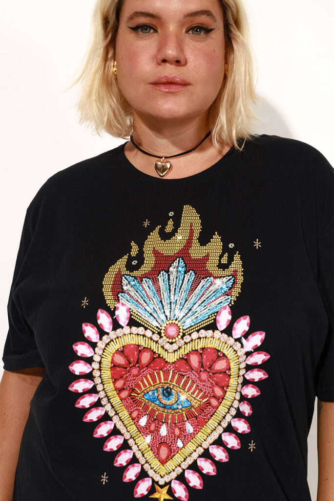 Apaixonante, não é mesmo? Agora vamos desbravar os detalhes dessa estampa, começando pelo coração com olho que simboliza a blindagem das energias negativas e mau olhado, assim como o olho grego. Além de trazer poder e proteção, como o olho de hórus, Egito antigo, por exemplo. O coração com fogo transparece a paixão, sensualidade, calor… aquele mood caliente, sabe? Já o coração com asas traz a sensação de liberdade, espírito livre e fé. Também tem o coração com traços realistas, simbolizando saúde, vigor, racionalidade e anatomia.